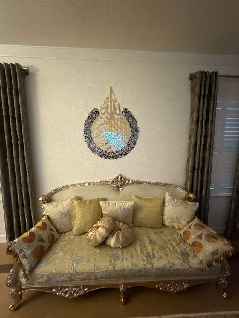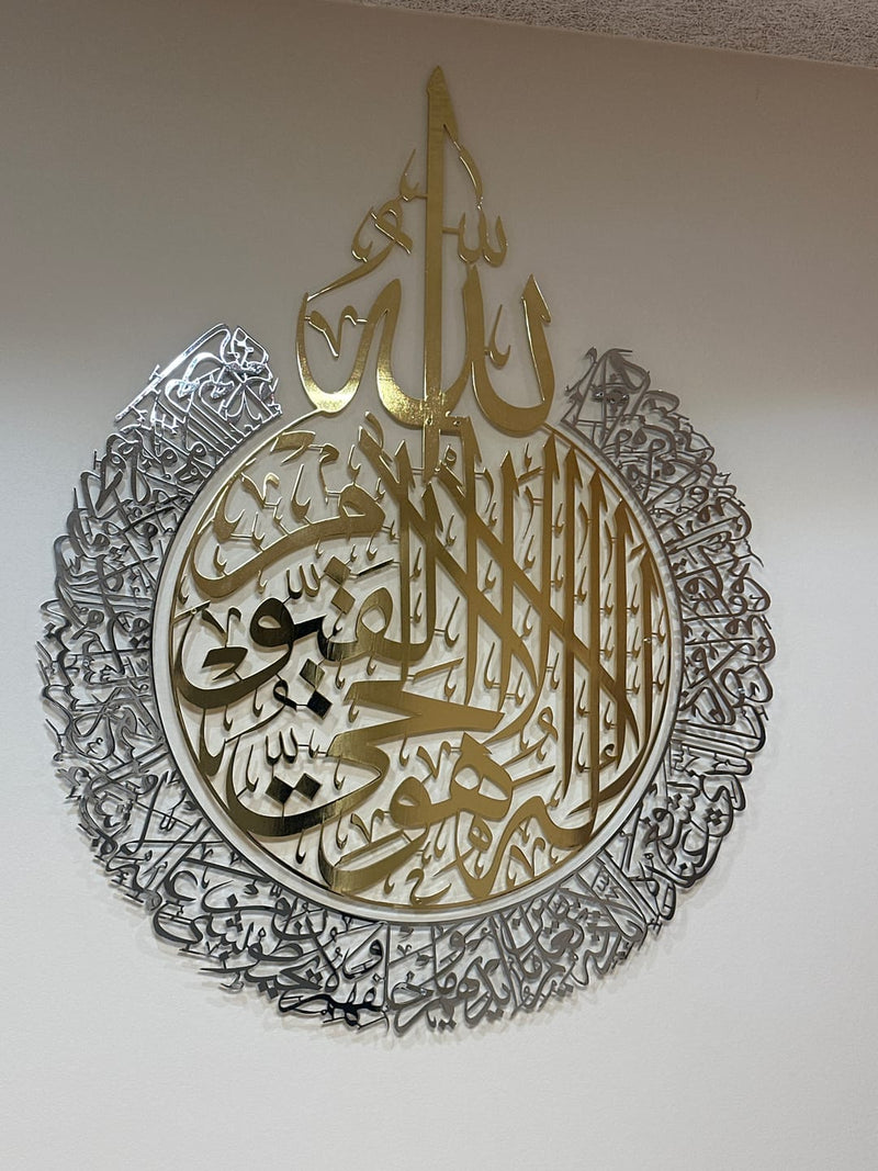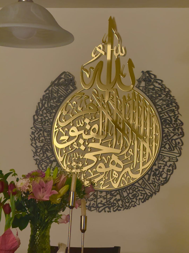 L’art mural islamique Calligraphie Ayat al-Kursi, un magnifique ensemble de 2 pièces, est parfait comme décoration de Ramadan, apportant à votre salon une atmosphère de paix et de spiritualité. Fabriqué avec soin en métal poli brillant, cet art mural met élégamment en valeur la sourate Ayat al-Kursi en calligraphie arabe raffinée. Idéal aussi bien pour les décorations de Ramadan que pour les célébrations de l’Eid Mubarak, ce décor mural islamique ajoute une touche à la fois moderne et spirituelle à n’importe quelle pièce.